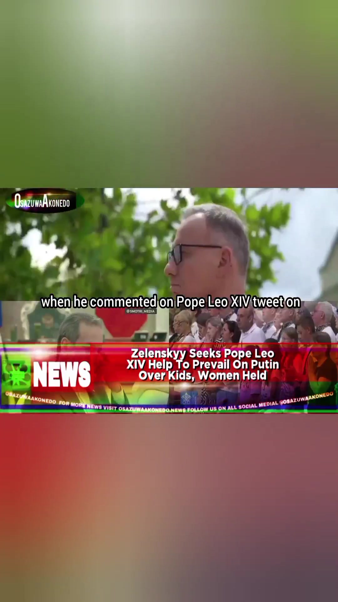 #World News #LeoXIV #Pope #Putin #Russia #Ukraine #Zelenskyy ©June 29th, 2025 ®June 29, 2025 5:00 pm Ukrainian President, Volodymyr Zelenskyy has sought the help of Pope Leo XIV to prevail on President Vladimir Putin of Russia to release Ukrainian children and women held in Russia, saying, the government of Russia held the children and women against their will, while he thanked the Pontifex for his continued prayers and compassion for the people of Ukraine. #OsazuwaAkonedo